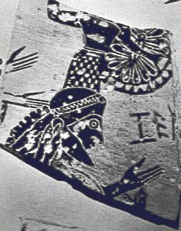 At the left side of the fragment two hands, palms turned to each other, are visible, probably the hands of a goddess on almost the same scale as Zeus.