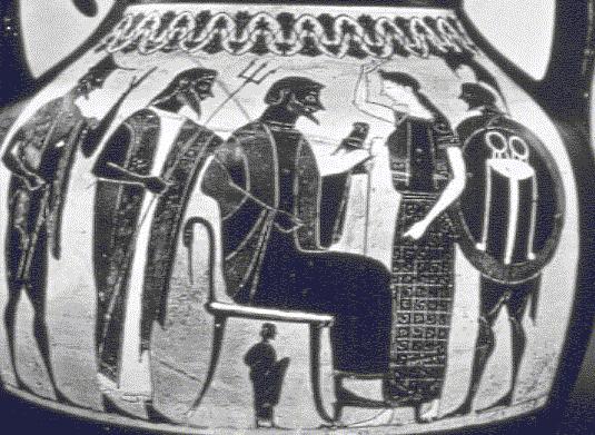 A god, presumably Zeus, is seated on an easy chair (?). He is