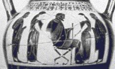 male, dressed in chiton and himation, holding a staff in the